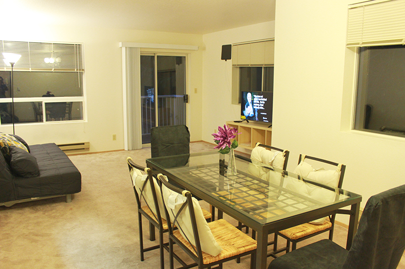 units are fully equipped, with a fully-furnished kitchen, dining room, and a full bath. Units also include a queen-size bed, chairs, a large desk, and a dining table. Some units include full-HD TV sets.