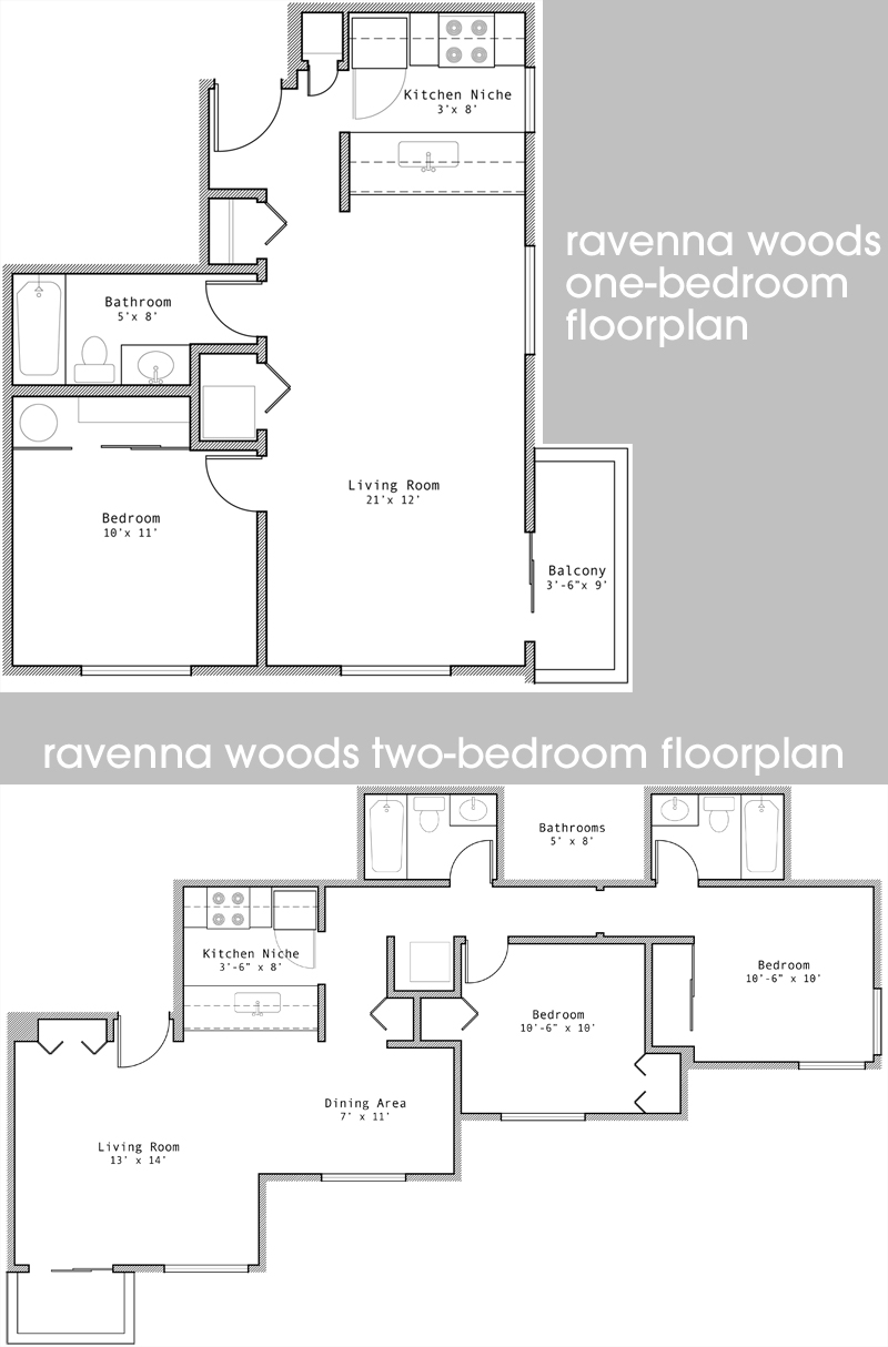 neighborhood, the Ravenna Woods Apartments are huge and bright, surrounded by trees and overlooking the U District. Many amenities are included: each unit has its own washer/dryer/dishwasher/garbage disposal/microwave/independent balcony. The two-bedroom apartments has two bathrooms. The parking garage features secure parking spaces.
